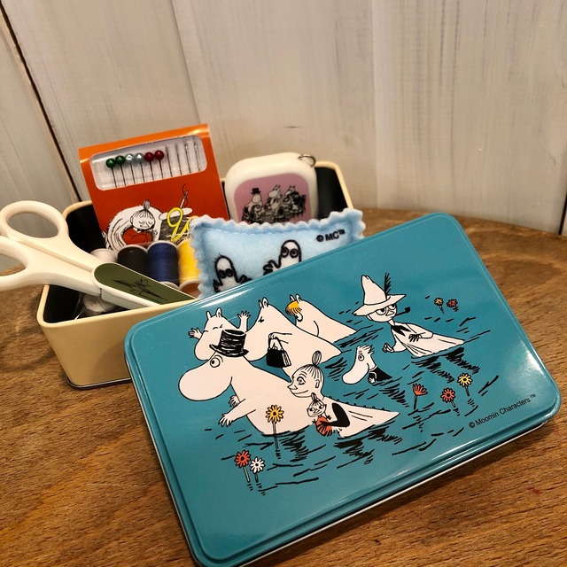 ムーミンのソーイングセットです。 小さなかわいい缶の中にお裁縫の基本グッズが入っています。 携帯しやすいコンパクトサイズ。 ギフトにも喜ばれそうですね。 【セット内容】 ピンクッション:6.5×4.5×2cm メジャー(1m):4×4×1.2cm ニードルセット(まち針6本、ワンタッチ針4本):5.5×6cm ステンレスはさみ:11.5cm ポリエステルスパン糸:6色各5m巻くらい 缶のサイズ:w12×d7.7×h3.7cm 生産国:日本(缶)、中国(小物類)