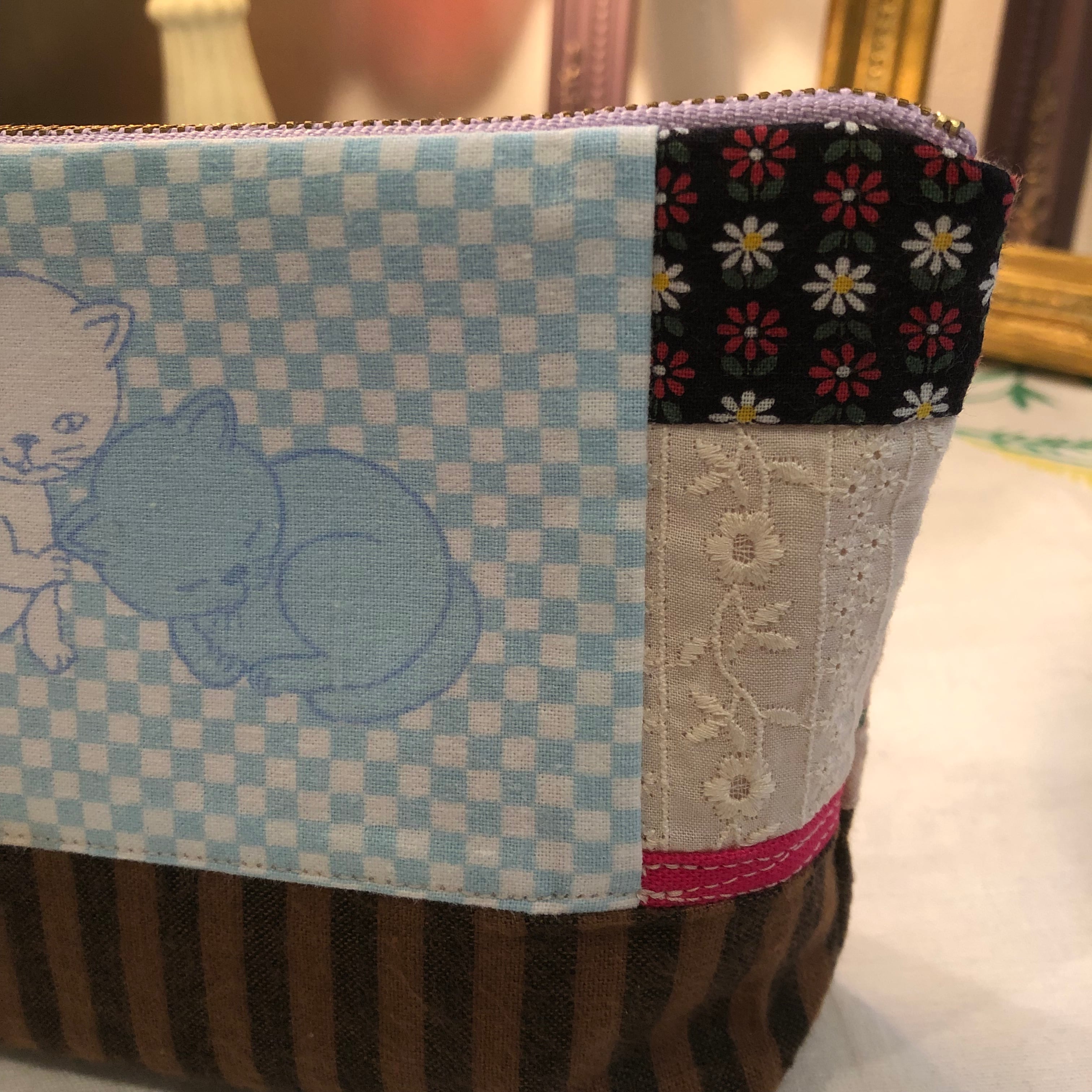 かわいいネコちゃんの柄をメインにパッチワークしました。