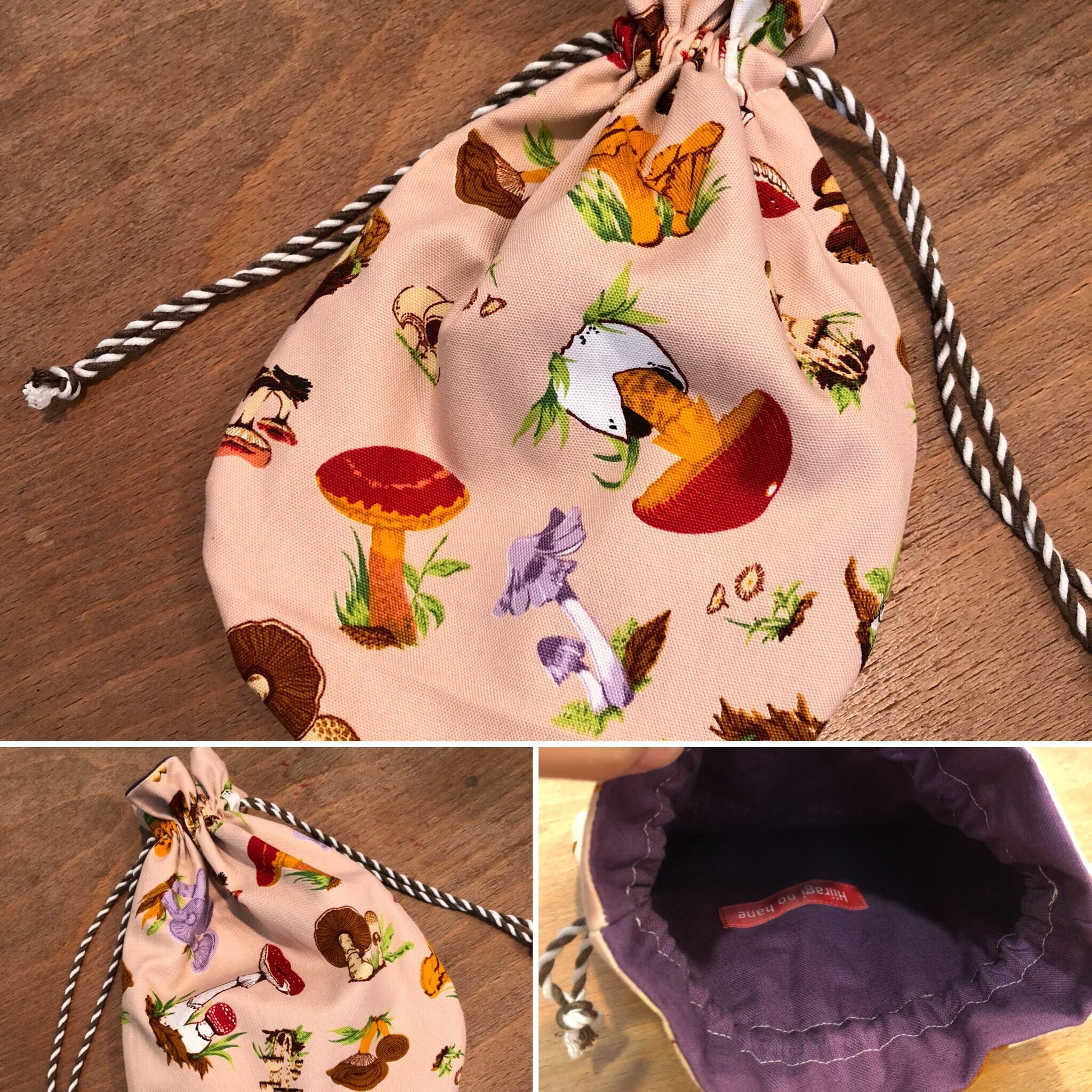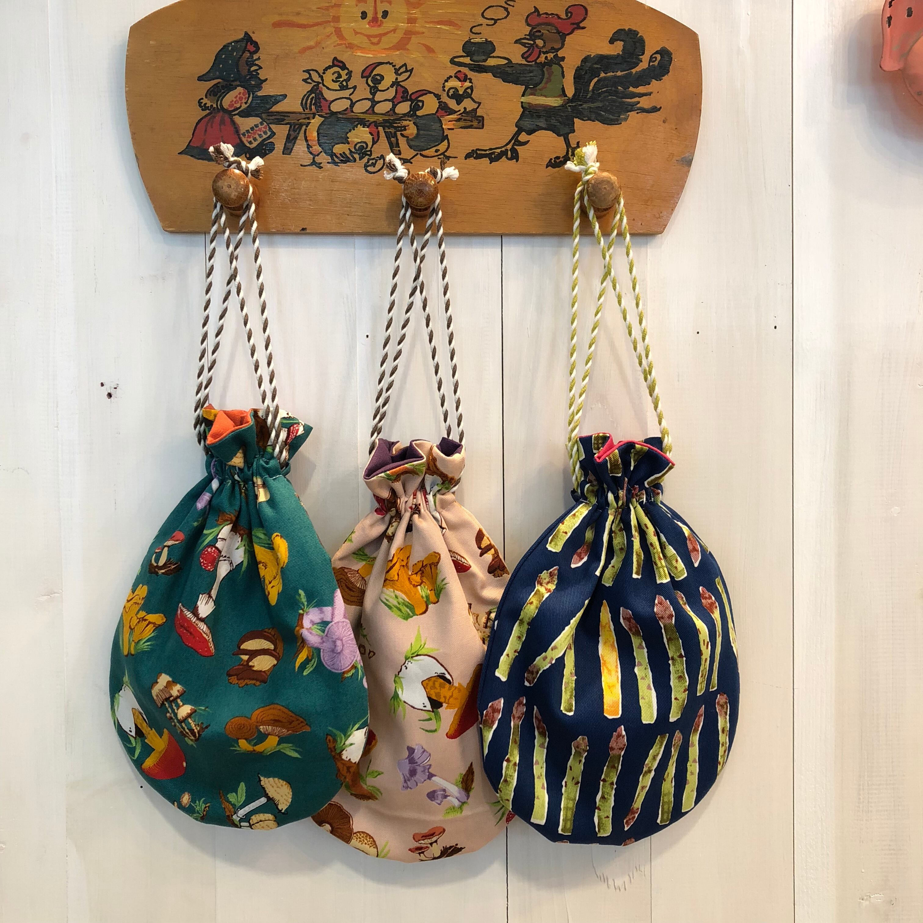 まるいかたちに大きな絞り口がかわいいきんちゃくです。