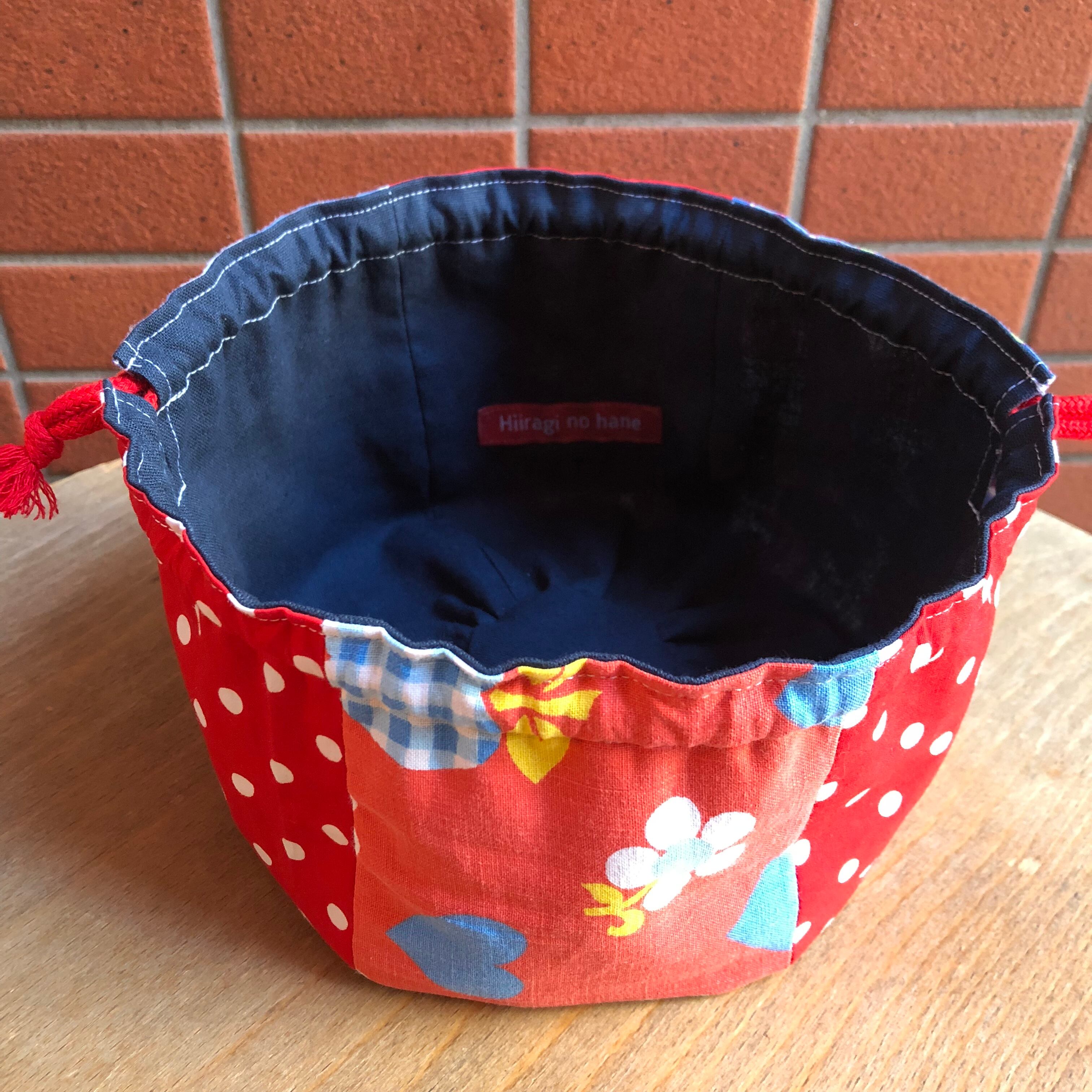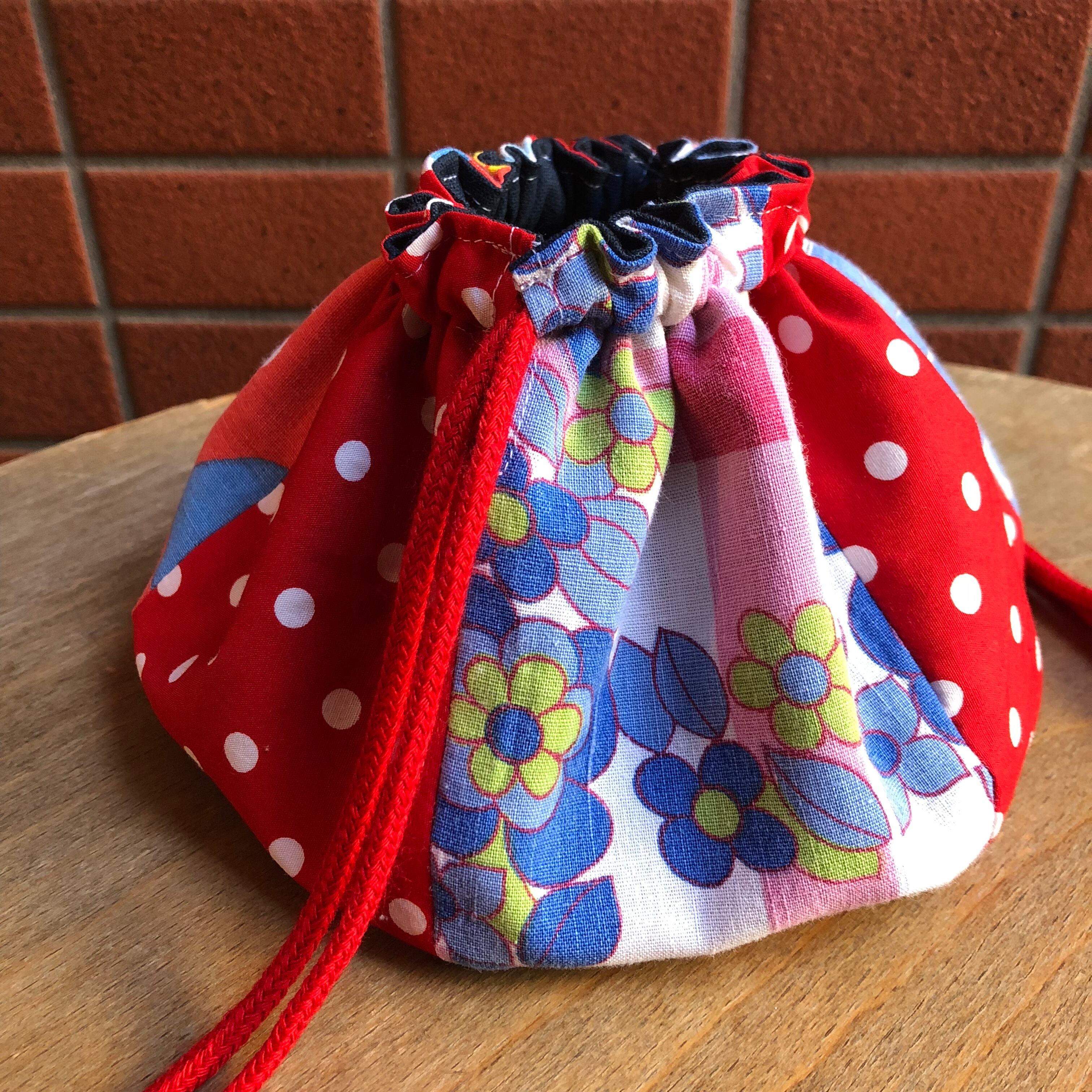 ヴィンテージファブリックをパッチワークして、かぼちゃみたいなかわいい形の巾着ができました。