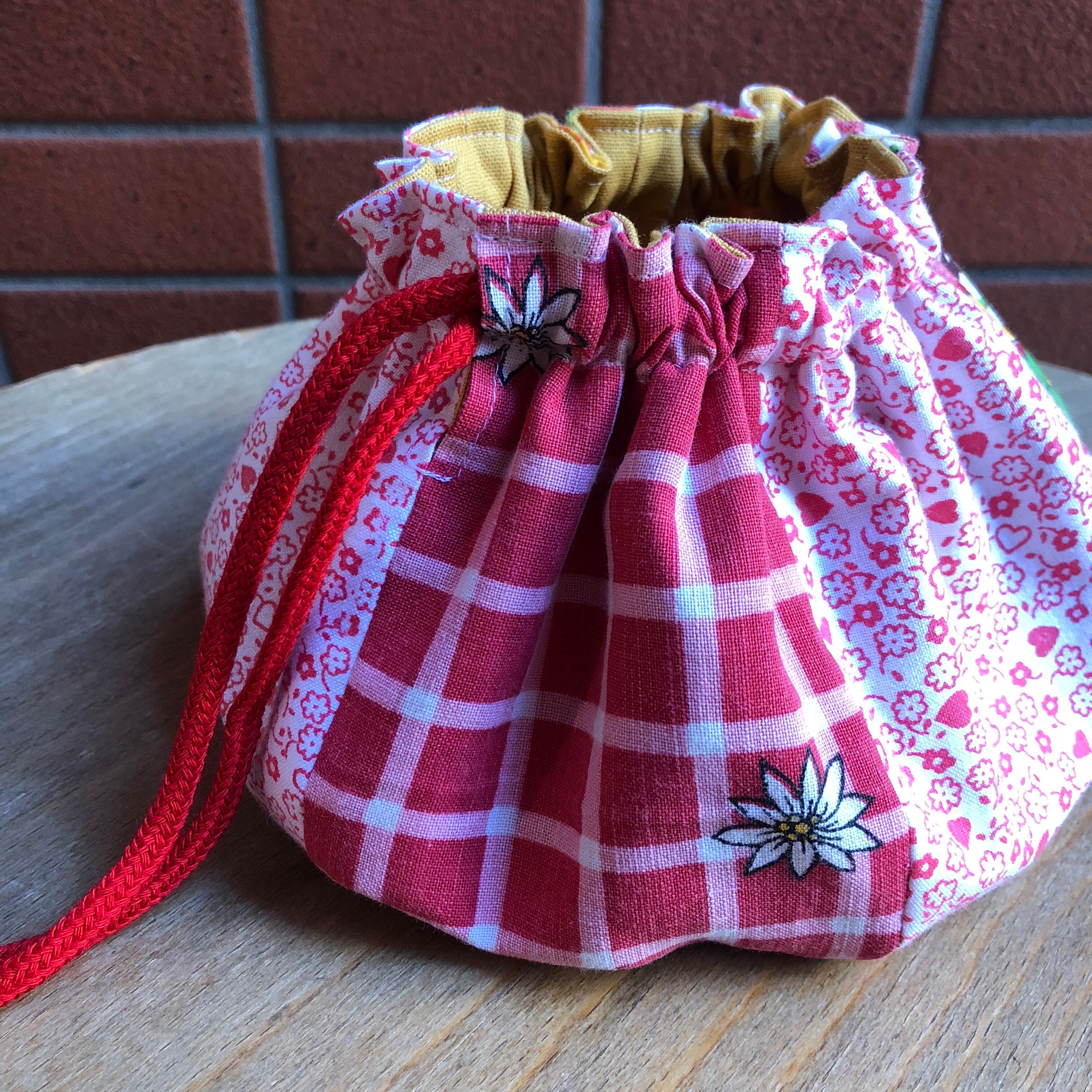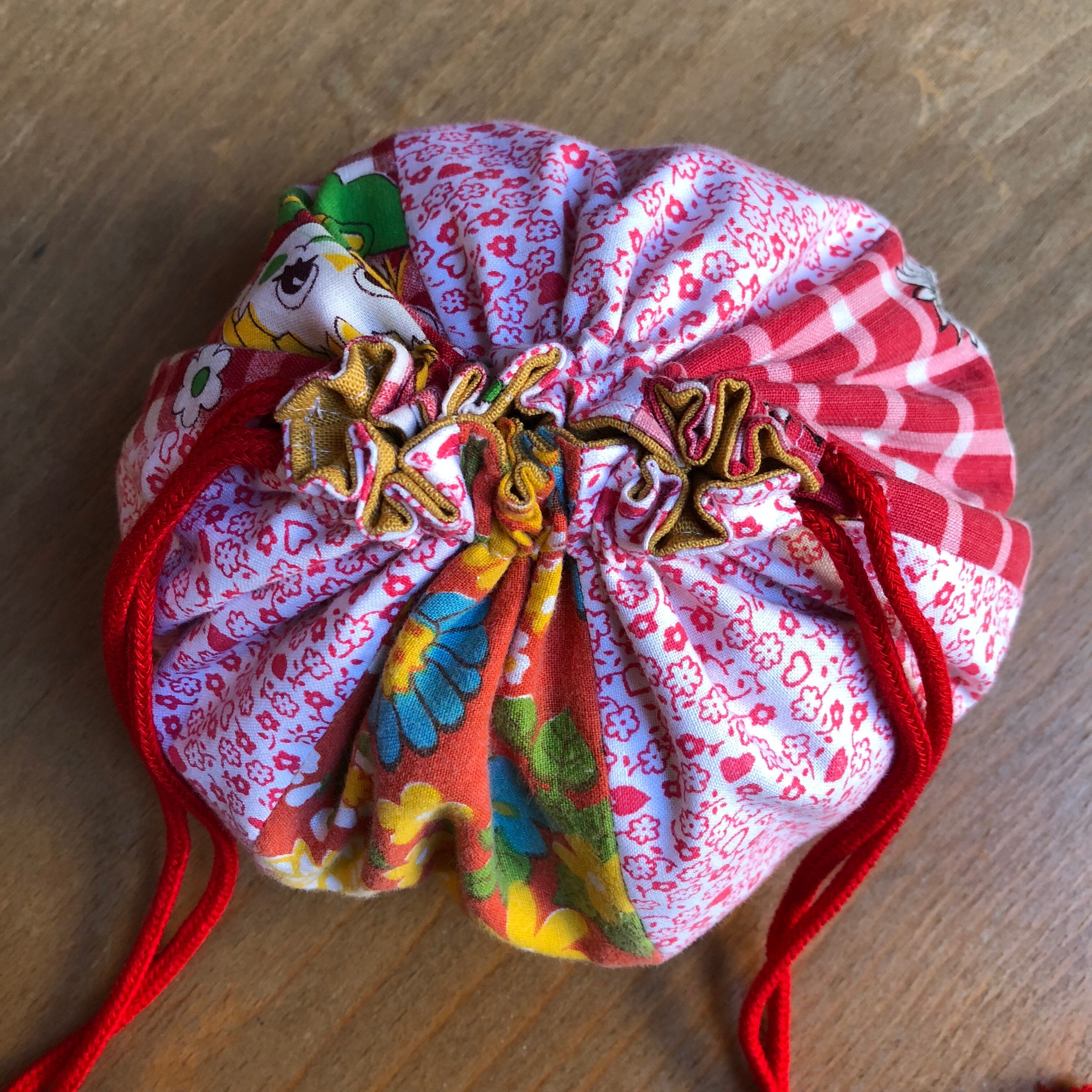 ヴィンテージファブリックをパッチワークして、かぼちゃみたいなかわいい形の巾着ができました。