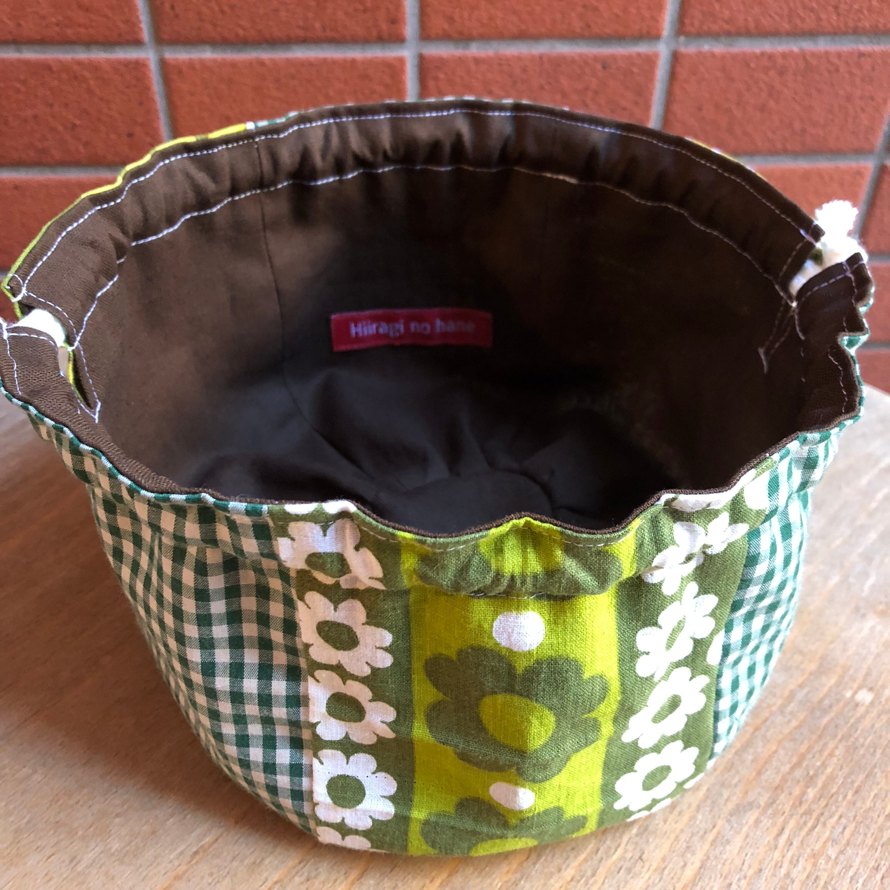 ヴィンテージファブリックをパッチワークして、かぼちゃみたいなかわいい形の巾着ができました。
