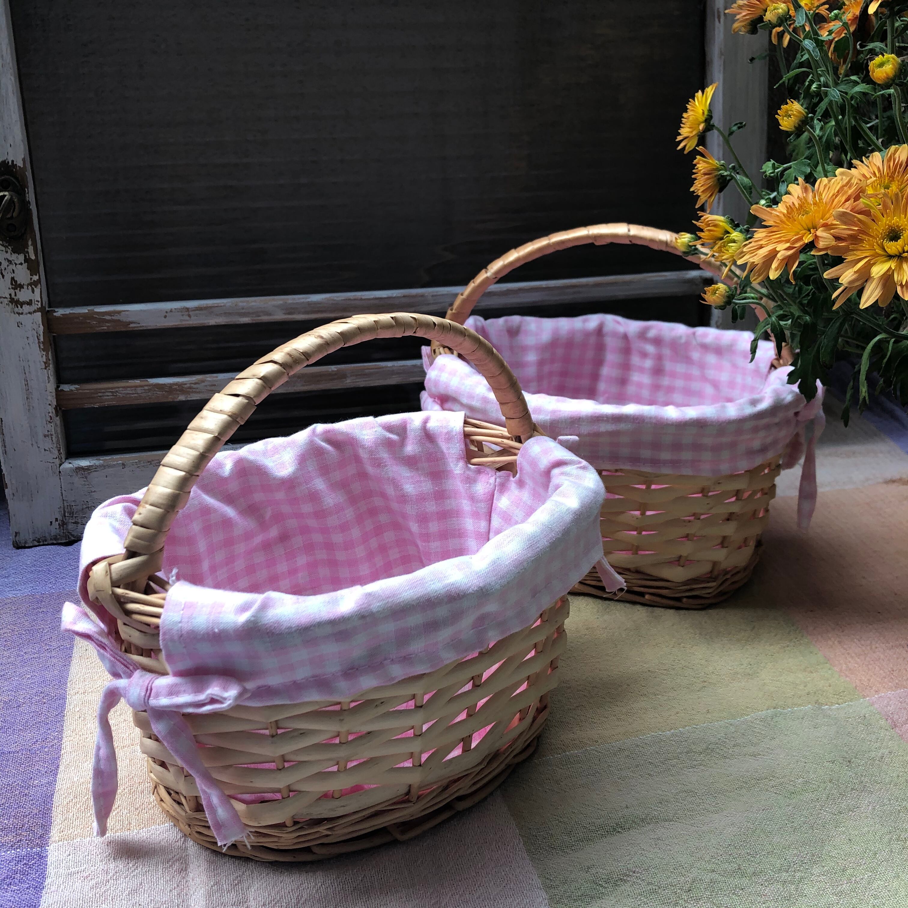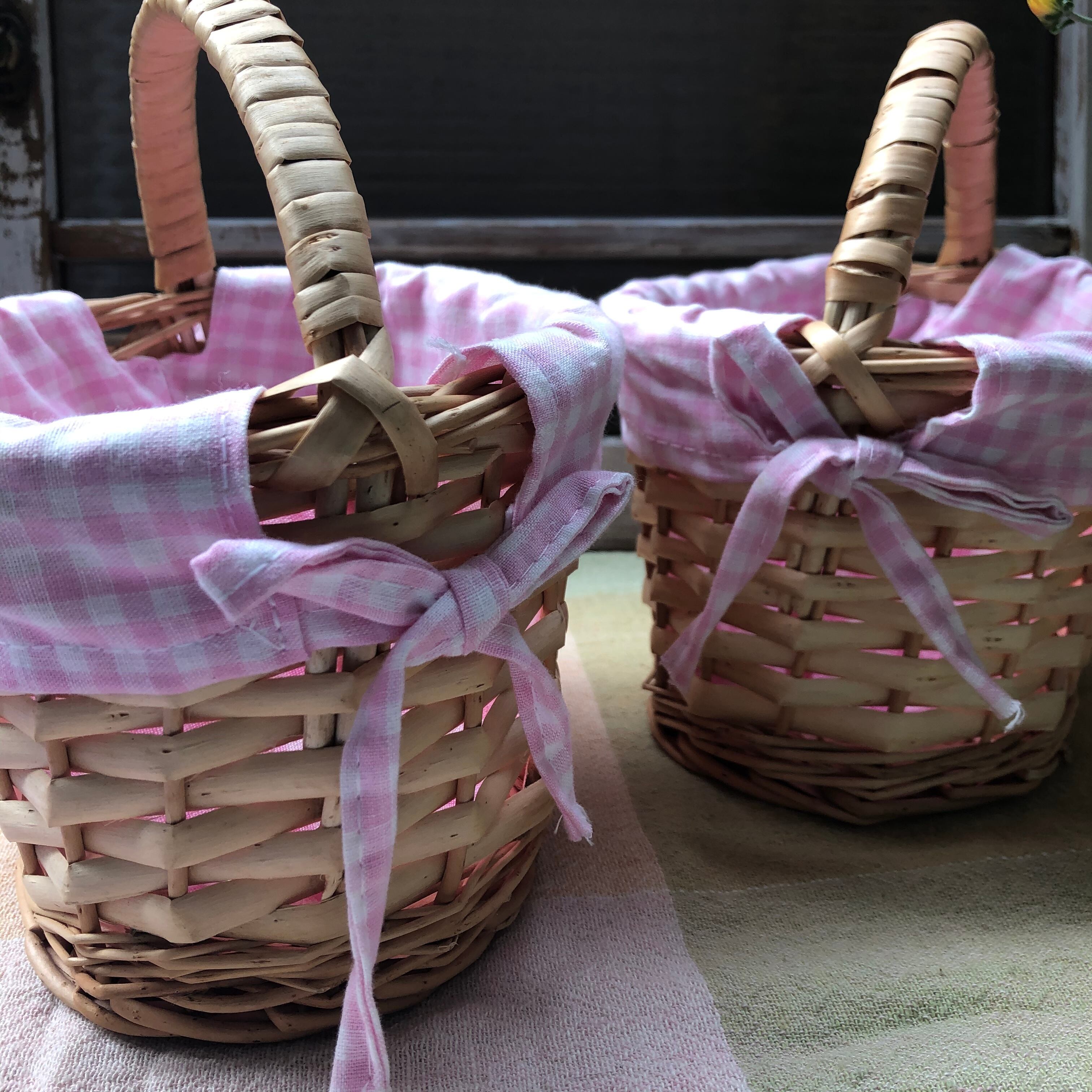 ギンガムチェックのカバーが付いたミニバスケット。