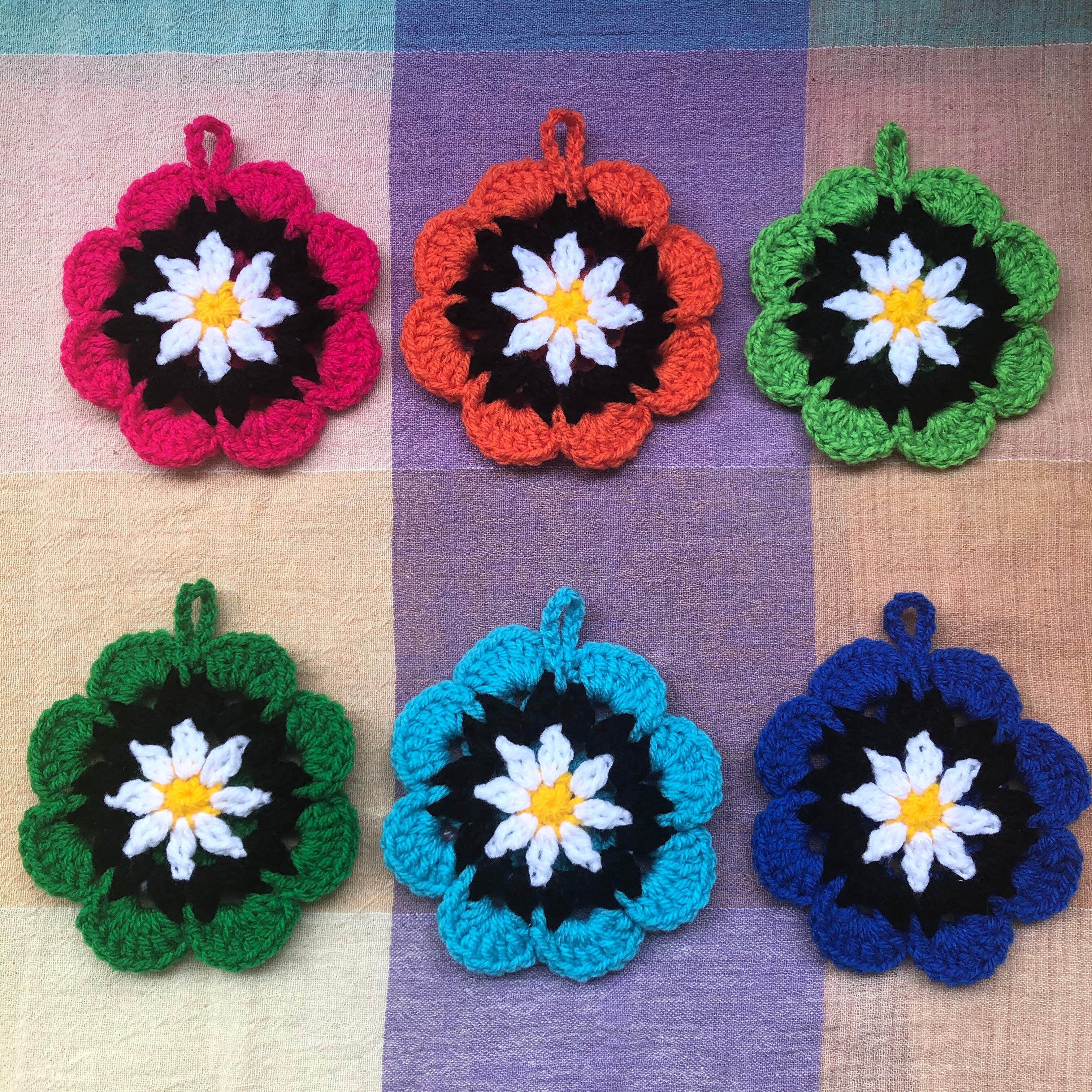 元気が出るパキッとあざやかなビビッドカラーで編みました。