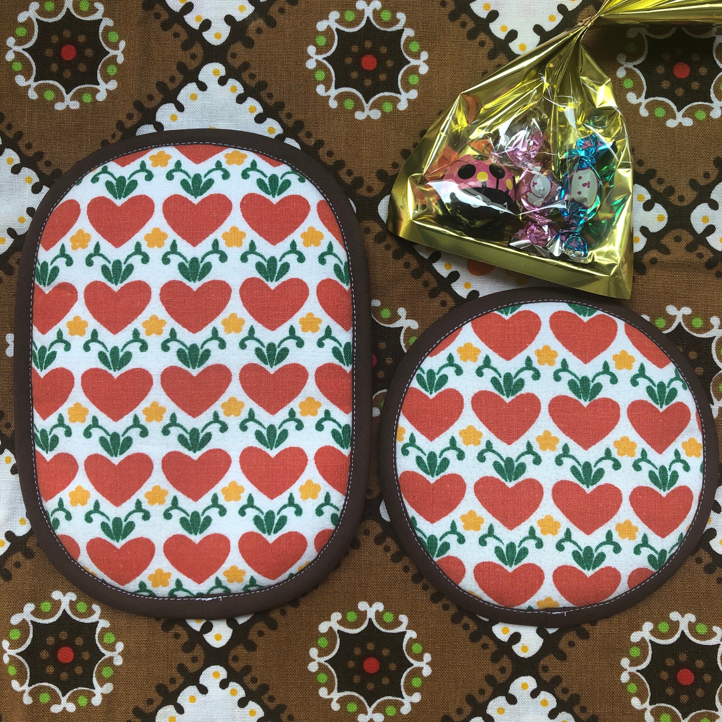 ヴィンテージのハート柄ファブリックでポットホルダーとコースターのハッピーなセットを作りました。