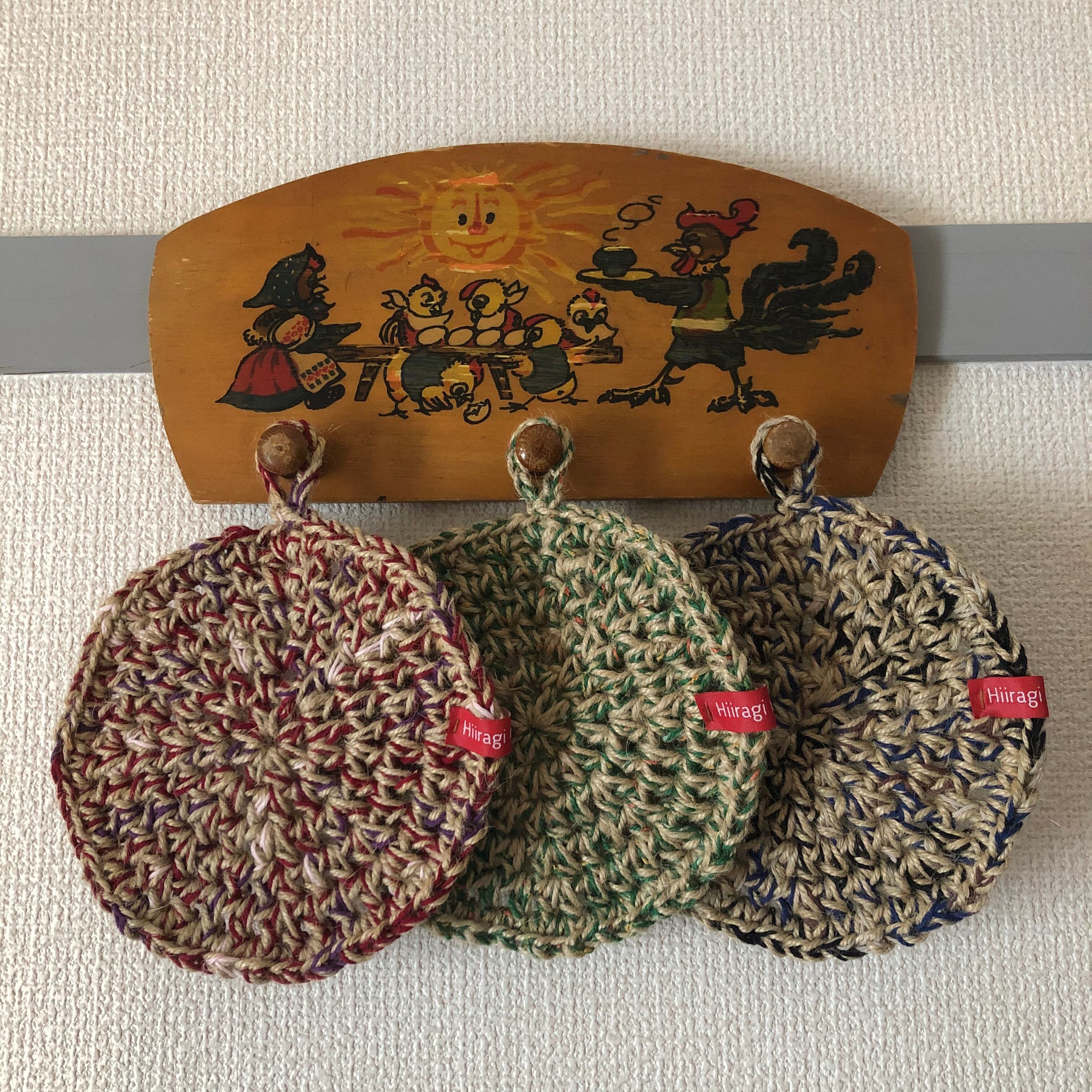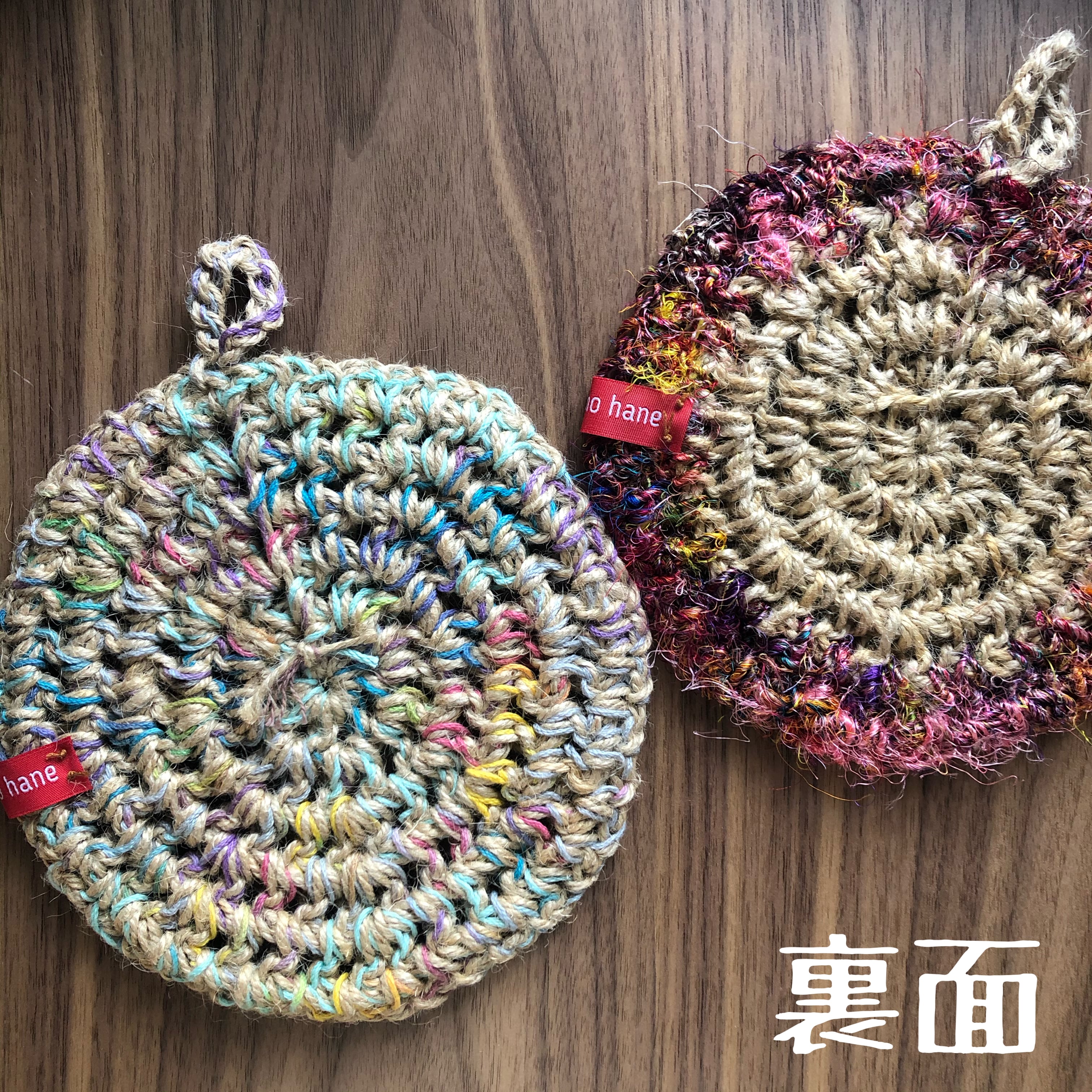 太めの麻糸とカラフルな糸をぐるぐる編んでマットにしました。